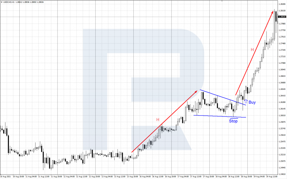- На H1 графике пары USD/CAD в ходе восходящего движения сформировалась фигура продолжения тенденции «Флаг».