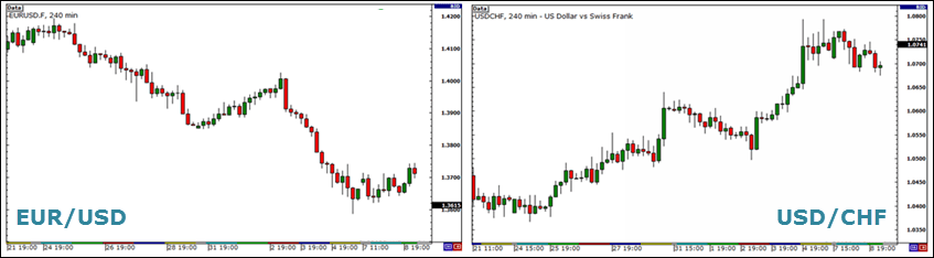 А теперь рассмотрим пары с противоположной корреляцией. Это активы EUR/USD и USD/CHF, которые настолько сильно коррелируют, что иногда коэффициент достигает -1, что является очень редким случаем, но здесь мы как раз имеем дело с ним.