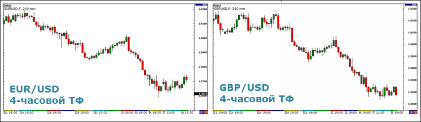 Предположим, у нас сейчас есть две коррелирующие валюты с коэффициентом в 0,94: EUR/USD и GBP/USD. У нас есть два графика.