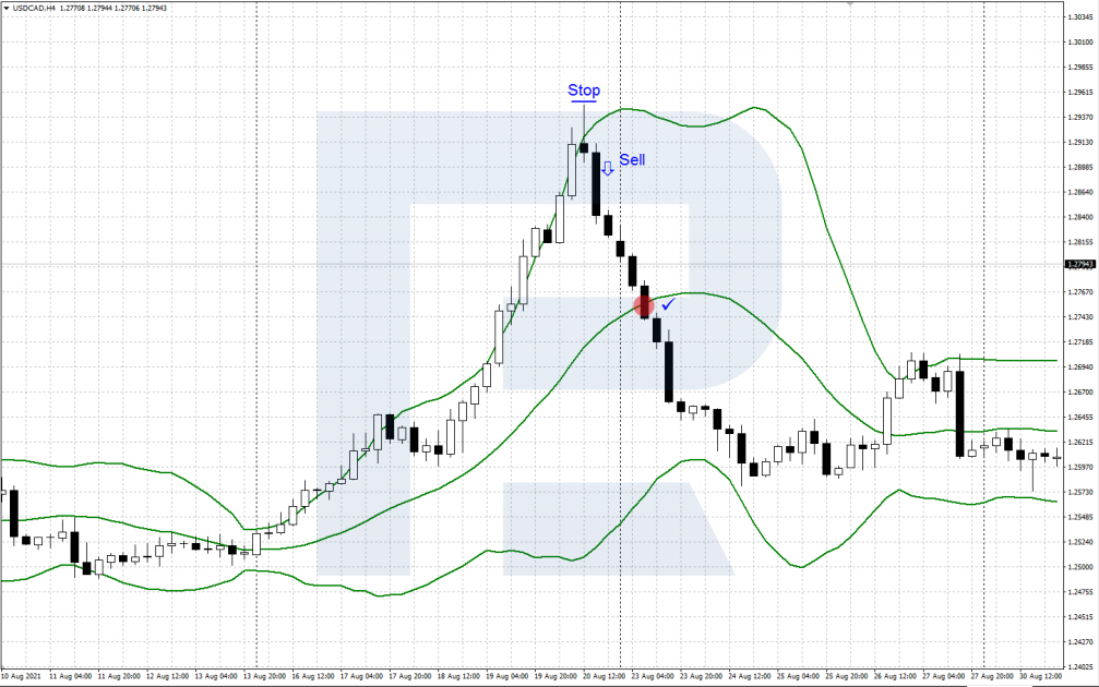 - Сигнал на продажу появляется после отбоя цены от верхней границы канала индикатора Bollinger Bands, при этом дополнительно сформировался разворотный свечной паттерн «Падающая звезда».