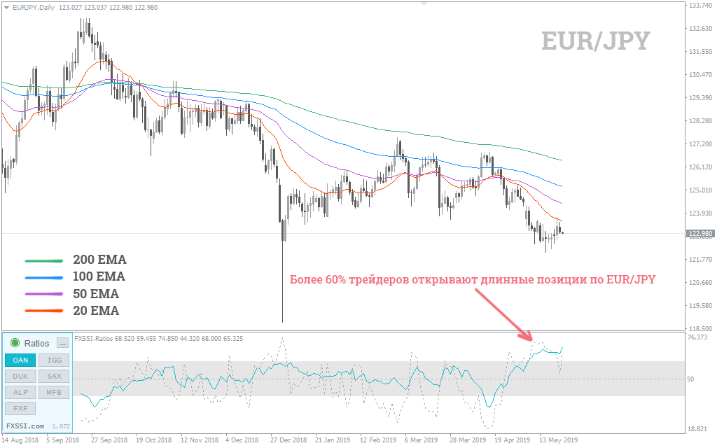 А сейчас давайте обратим наше внимание на график индикатор Ratios на котором видны преобладающие длинные позиции розничных трейдеров. Это дает нам основание ожидать нисходящего тренда в ближайшем будущем