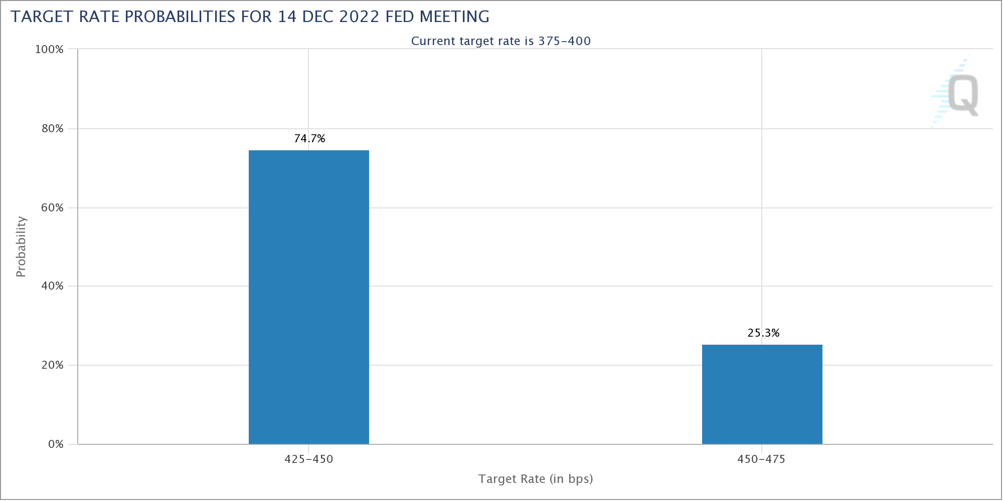 Инструмент FedWatch Tool от CME показывает вероятность в размере 75 процентов, что следующее повышение кредитной ставки произойдет на уровне 50 базисных пунктов (0.5 процента). Напомним, ранее базовую ставку повышали на 75 базисных пунктов, причём это продолжалось с лета. Соответственно, в теории рост показателя на 50 базисных пунктов будет выглядеть положительно.