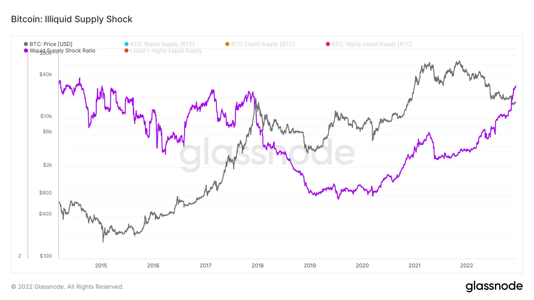 Согласно метрике под названием Illiquid Supply Shock Ratio (ISSR), вероятность возникновения крупного ажиотажного спроса на BTC выше, чем когда-либо почти за десять лет.