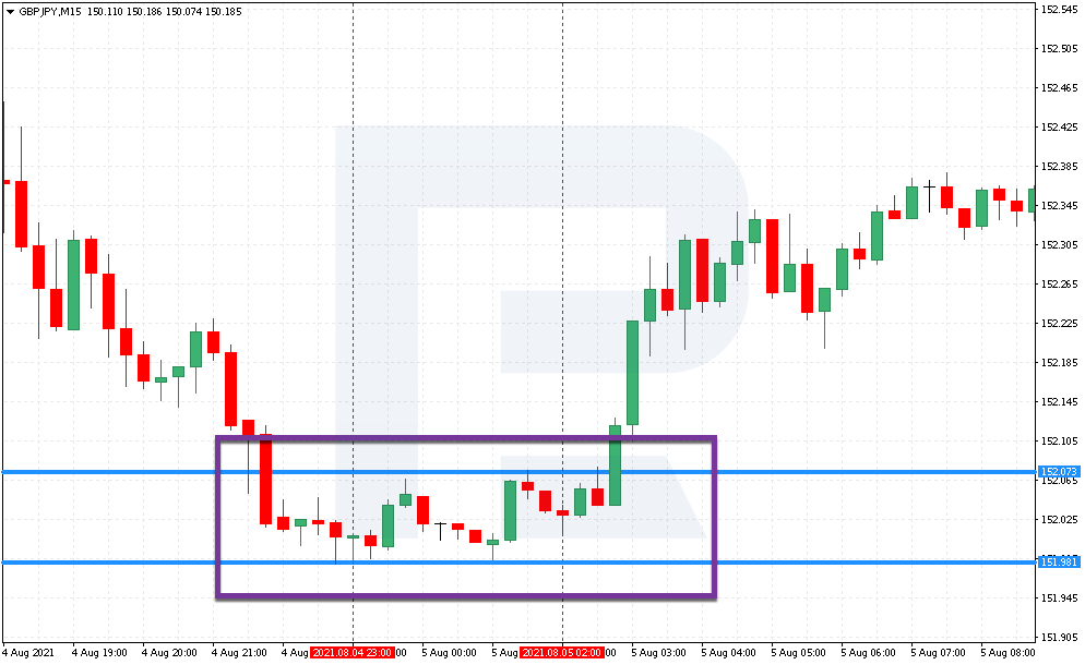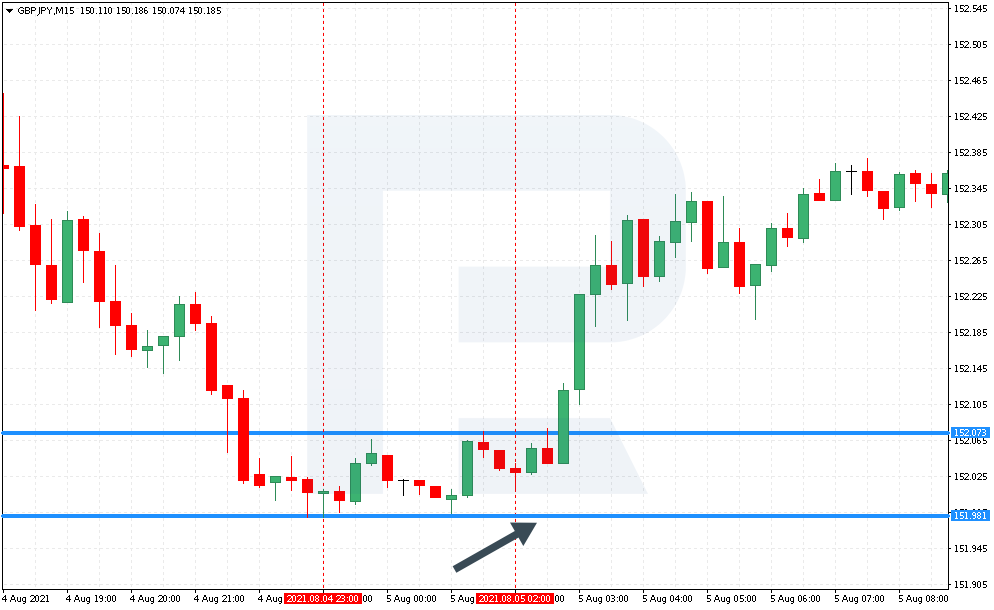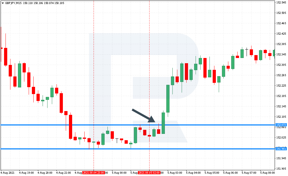 Теперь рассмотрим пробой диапазона вверх. Отмечаем начало коридора в 23:00, где и был минимум 151.91, который цена протестировала в дальнейшем. Максимум располагается на уровне 152.07.