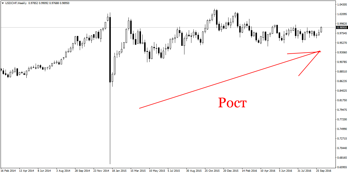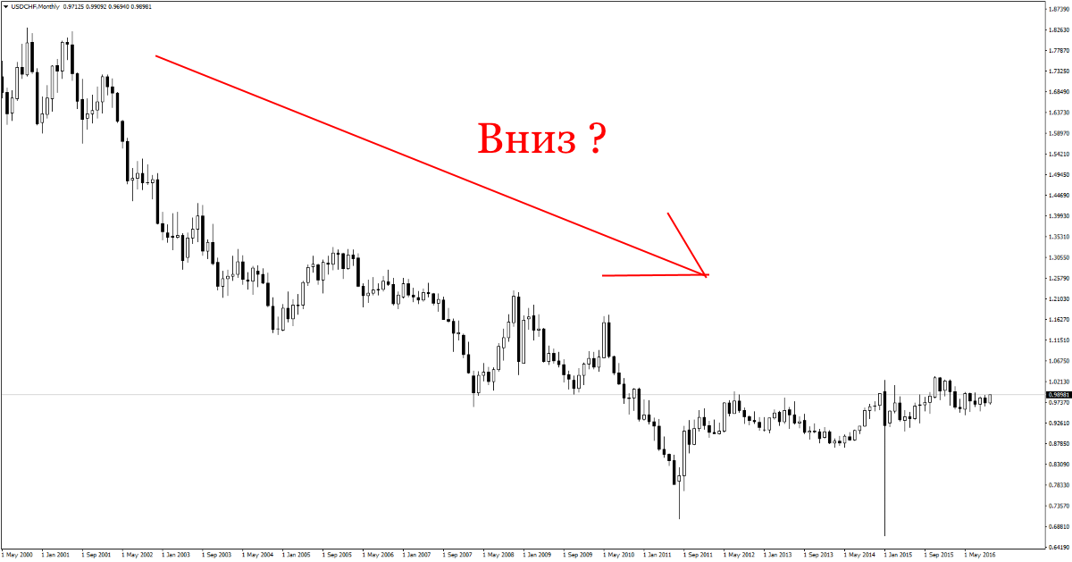 Если открыть месячный график USDCHF, покажется очевидным, что глобальный тренд у пары нисходящий.