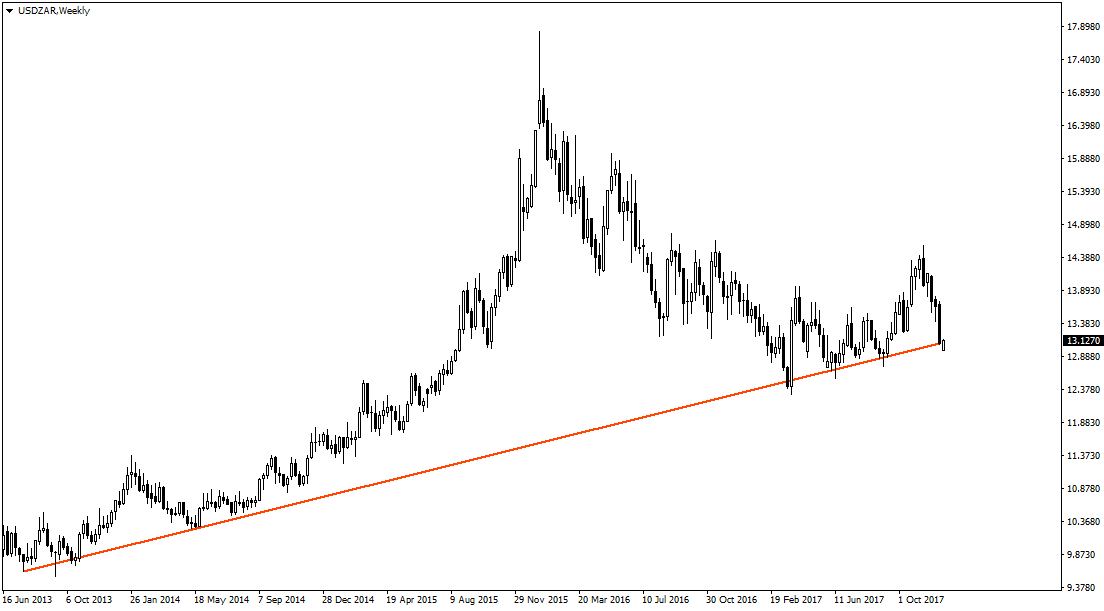 На недельном графике невооруженным глазом видно, что долгосрочный тренд пары USDZAR восходящий, то есть, доллар растет, а рэнд падает. Тем не менее, последние два года (с начала 2016) ситуация складывается в обратную сторону.