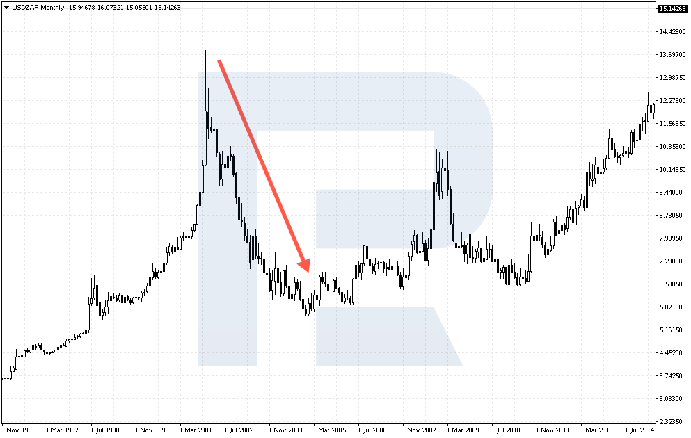 Восстановление экономики произошло в конце 2001 года. Тогда за 3 года курс пары упал с 13.85 до 5.60. Но замедление экономики Китая, важнейшего партнера Южной Африки, обвалило курс ранда до 11.90 к концу 2008 года.