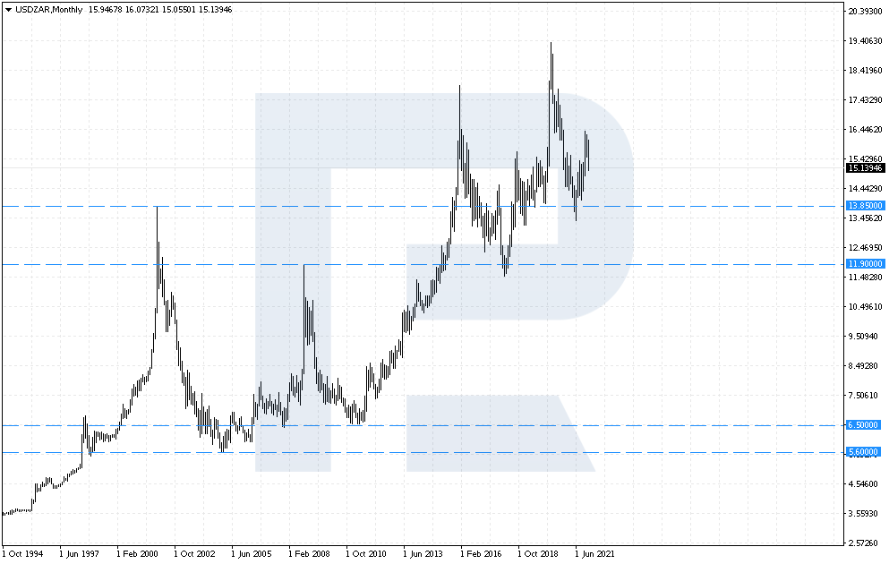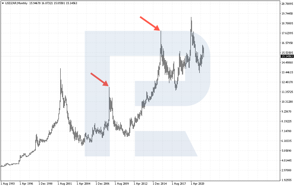 В 2015 году курс USD/ZAR обновил максимум 2001-го и сейчас остаётся выше этих значений.