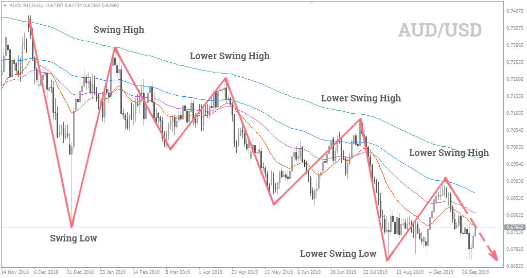 За последние 12 месяцев пара AUD/USD упала более чем на 7%. Это ниже, чем у большинства других пар из нашей таблицы. Легко заметить, что откаты в противоположную от доминирующего нисходящего тренда сторону были в целом менее резкими, чем на графиках EUR/JPY и NZD/USD.
