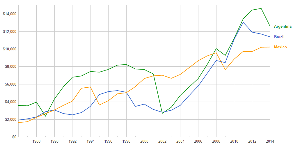 О стабильности экономики страны во многом говорит уверенный рост показателей ВВП. Как видно на графике выше, несмотря на значительное влияние кризисов 1994 и 2008 годов, после недолгих периодов рецессии показатели в течении короткого промежутка времени возвращались к прежним значениям. А, к примеру, южноамериканский кризис 2002 года и вовсе практически не повлиял на ВВП страны, показывая хоть и небольшой, но положительный прирост. Реакция же Аргентины была значительно сильнее, практически достигнув своего 13-летнего минимума и только после этого начав процесс восстановления.