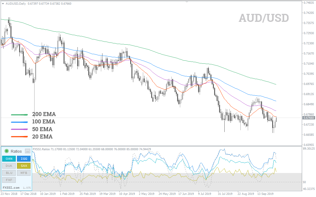 Как и в случае с двумя другими рассмотренными парами, четыре экспоненциальные скользящие средние направлены также параллельно друг другу на дневном графике AUD/USD. Это означает, что в этой паре все еще преобладает сильное давление продавцов.