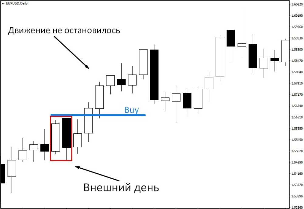 Внешний день – дневная свеча, полностью поглощающая своим диапазоном предшествующую свечу.