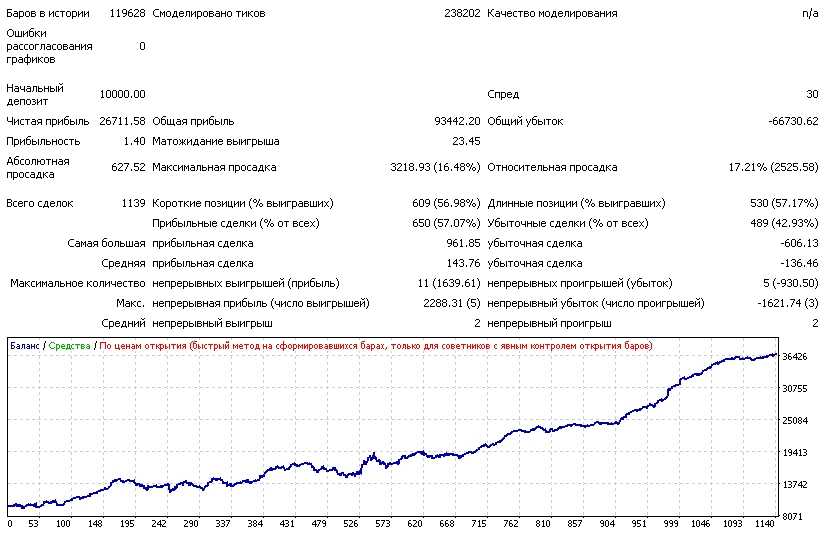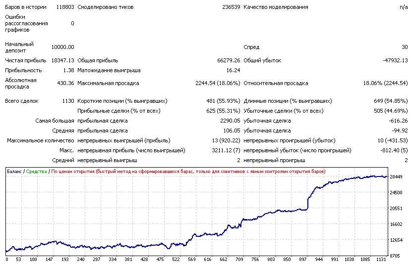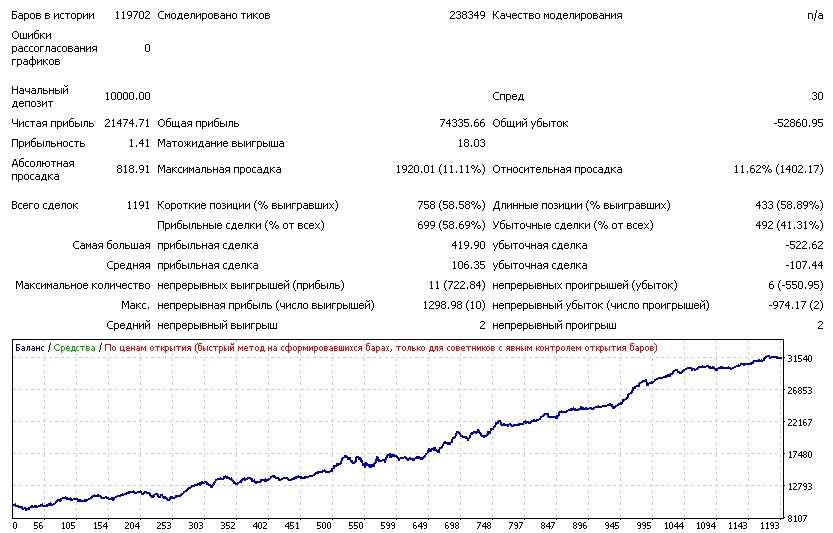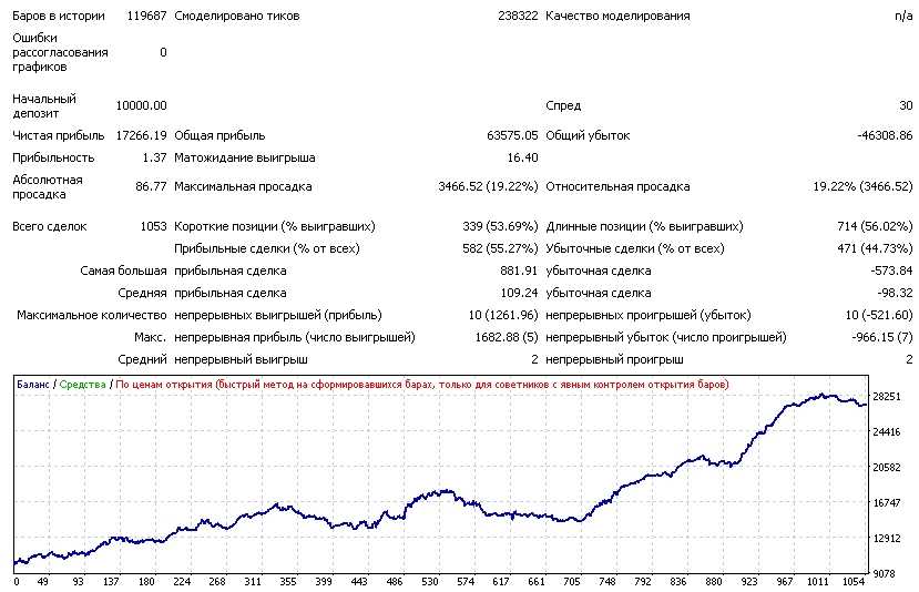 Я знаю, что многие очень любят применять мартингейл для слива своих депозитов, поэтому, чтобы мои исследования не были такими скучными, я попробовал протестировать паттерн, используя мягкий вариант мартингейла. Его смысл заключается в том, что он включается после 2-4 убыточной сделки и после определенной серии выигрышей (даже если из просадки советник выйти не успел) он отключается. В отличие от менее умных вариантов, этот позволяет депозиту прожить заметно дольше. Настройки я не стал тщательно оптимизировать, выставил первые более менее привлекательные результаты. Давайте, в развлекательных целях, посмотрим, что же у нас получилось: