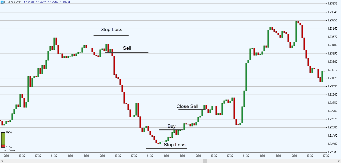 В первом случае важно дождаться ситуации, когда цена расположится где-то посередине диапазона, открыть 2 сделки в разных направлениях. Стратегически верно поставить Take Profit на одинаковом расстоянии и ждать, что произойдет с рынком