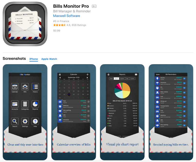 class=»img-responsive»>Ежемесячно каждый человек совершает перечень обязательных финансовых операций, связанных с затратами на коммунальные услуги, аренду, оплату школ, садов, кружков, тренажерного зала. Просрочка по платежу чревата дополнительными расходами. Монитор счетов позаботится о своевременных выплатах, позволив привязать затратную строку к определенной календарной дате и установить напоминание. Весь перечень совершенных операций с деньгами сохраняется в истории платежей. Программа содержит встроенный поисковик, позволяющий найти информацию используя ключевые слова и отображает выплаты в виде красочной круговой диаграммы с пояснениями по каждому сегменту. Рейтинг 5,0 на App Store.
