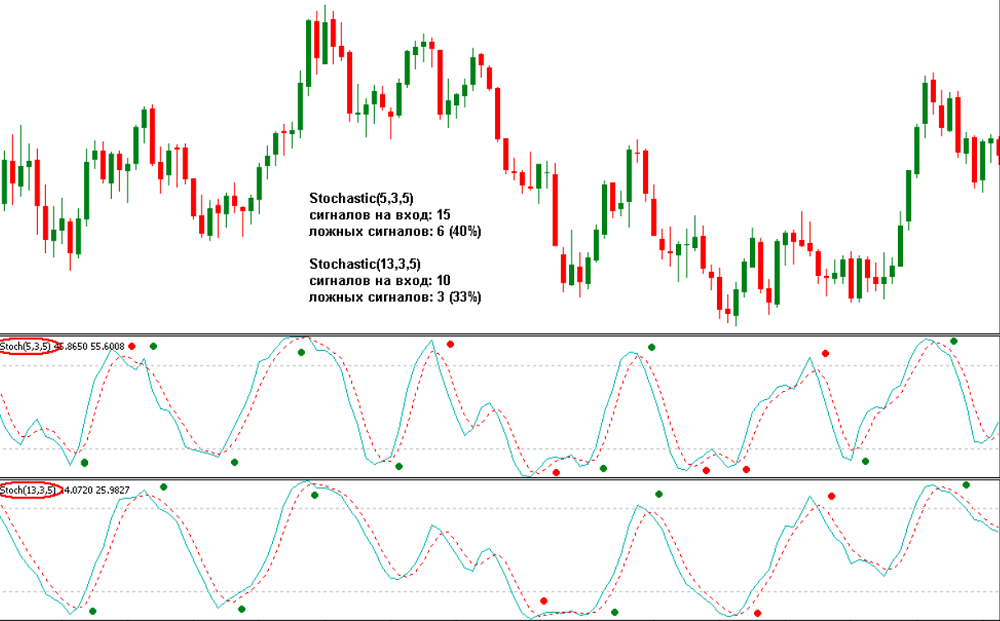 На изображениях снизу приведены наглядные примеры работы данного индикатора, которые сравниваются с работой обычного «Стохастика». Параметры обоих инструментов идентичны.