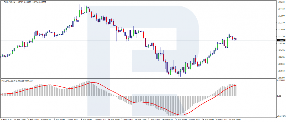 - на график H4 устанавливаем индикатор MACD.