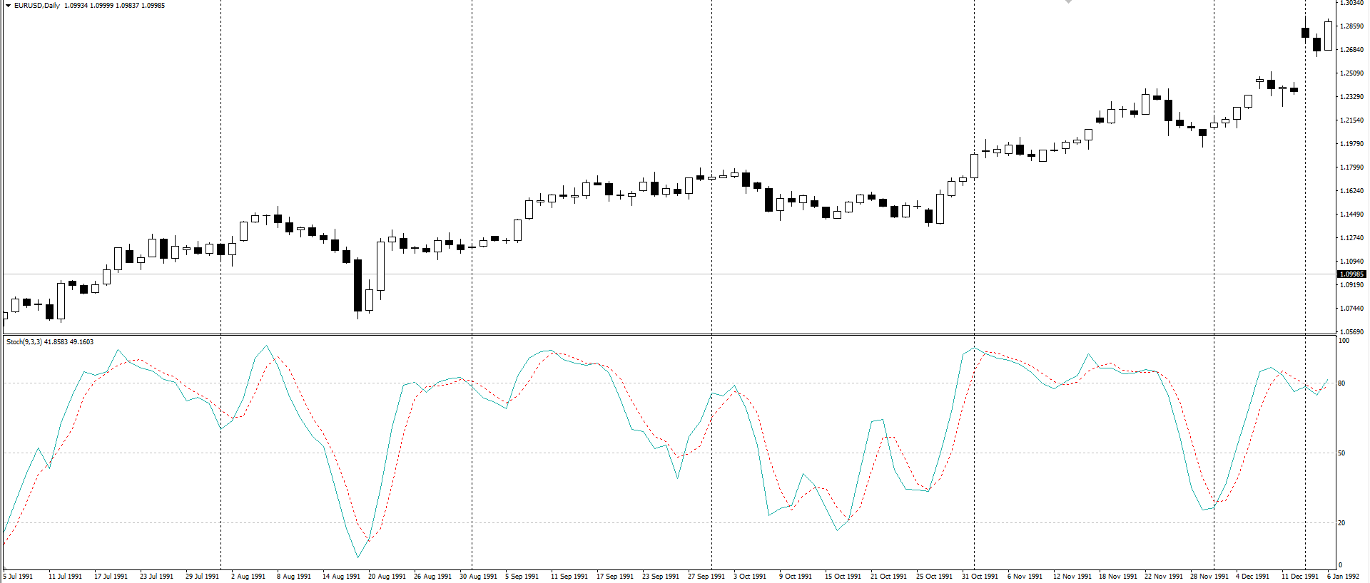 Когда вы используете дополнительную скользящую среднюю для замедления исходной формулы стохастика, стохастик называется медленным. По умолчанию торговая платформа MetaTrader 4 показывает медленный стохастик, основанный на дополнительной 3-периодной скользящей средней. По оригинальной формуле стохастик называется быстрым.