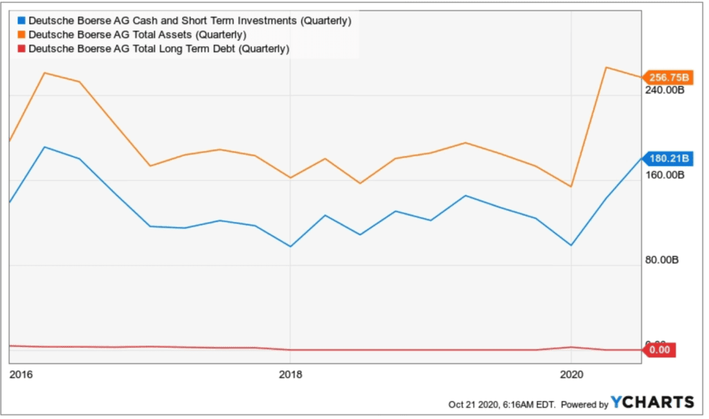 У Deutsche Borse, в принципе, нет долгов. Поэтому её можно назвать оплотом финансовой стабильности. На балансе компании находятся общие активы почти на 257 миллиардов долларов. И з них наличные и эквиваленты составляют 180 миллиардов долларов.