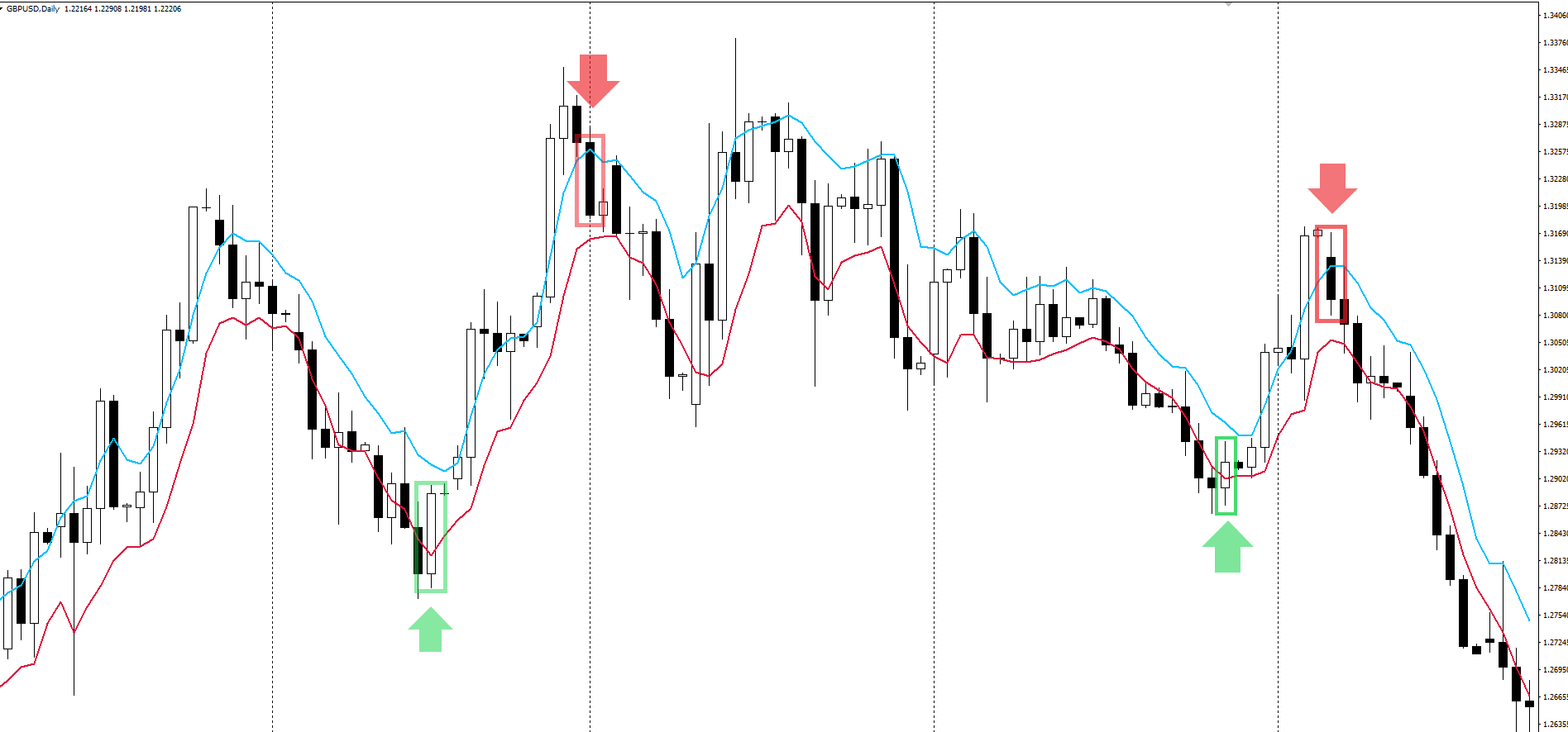 Синяя линия на изображении снизу – это скользящее среднее с периодом 89, которое показывает, что рынок находится в нисходящем тренде. Последняя свеча на графике оказалась четко под скользящим средним, поэтому в этом случае вы будете искать лишь коротких сделок. Если бы она оказалась выше скользящего среднего, вы бы искали исключительно длинных.