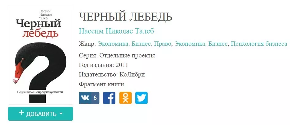 Достаточно выбрать кнопку с подходящим форматом для вашего устройства — у нас представлены txt (зеленая), fb2 (голубая), rtf (оранжевая), epub (фиолетовая). Кнопку нужно нажать и файл с книгой «Черный лебедь. Под знаком непредсказуемости» Нассима Николаса Талеба сразу загрузится на ваше устройство. Приятного прочтения!
