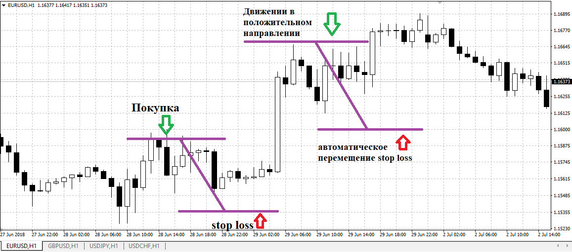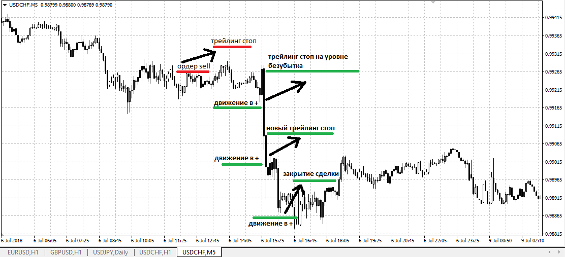 - применение трейлинг стопа, позволяет трейдеру максимально использовать потенциал рынка, ограничивая риски и потери;