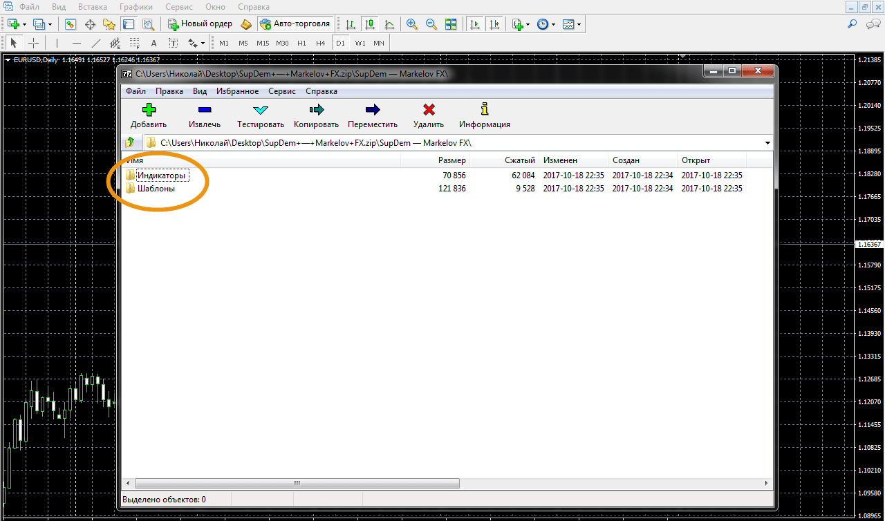 «Индикаторы» — здесь содержатся файлы индикаторов. Непосредственно в данном примере, в папке находятся 3 версии «SupDem» (1-я, 2-я и 4z).