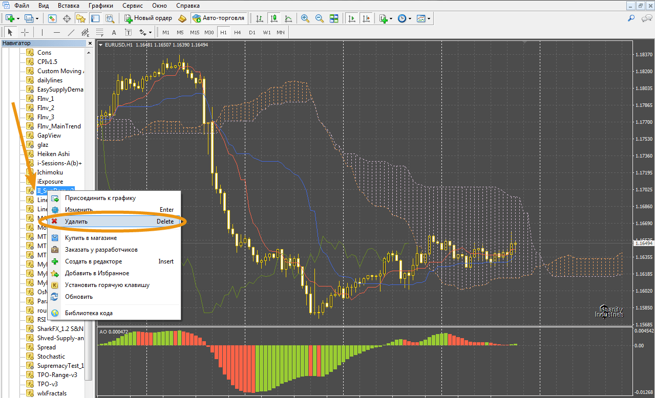 Если по какой-либо причине вам необходимо удалить индикатор полностью из программы, то откройте навигатор, обозначьте нужный инструмент, нажмите правую кнопку мыши и выберите «Удалить» (или «Delete» на клавиатуре):