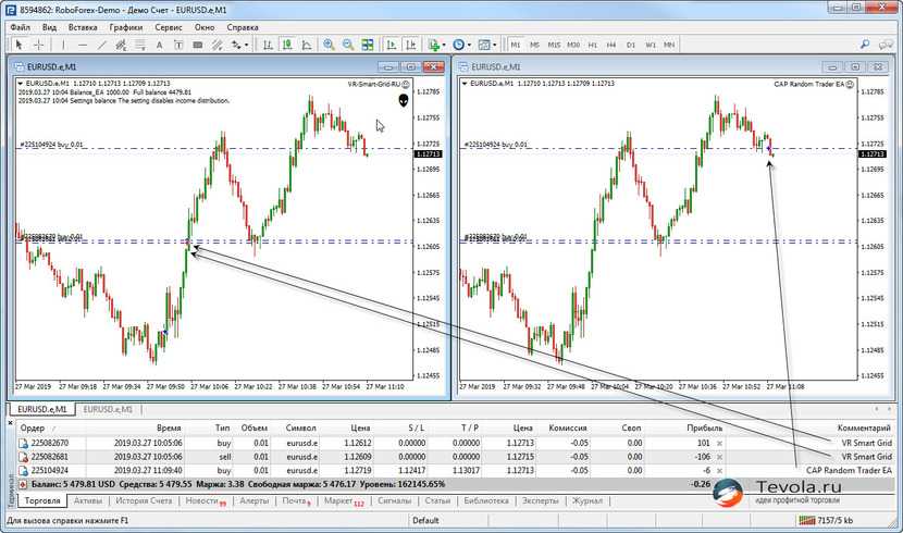 Далее, открываем в терминале два окна с графиком (допустим как у меня с EURUSD) и на каждое окно устанавливаем советника с разными MagicNumber. Вот и все, два робота трудятся на одном графике по разному алгоритму.
