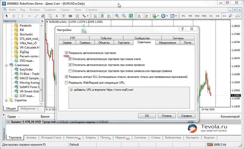 - Первым делом разрешите в терминале авто торговлю, для этого перейдите в Сервис > Настройки > Советники и поставьте галочку «Разрешить автоматическую торговлю». Там же, в случае использования вашим советником dll или WebRequest,