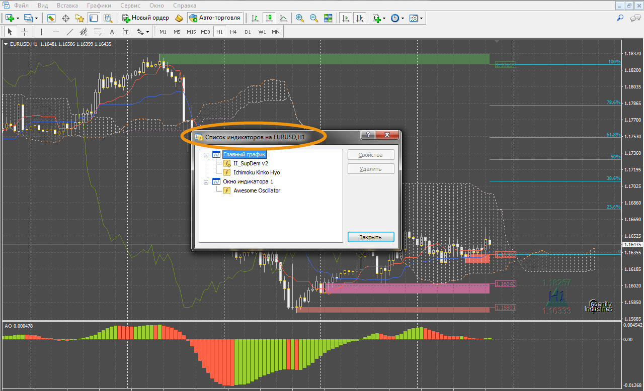 Нажмите на свободное место графика правой кнопкой мыши и выберите пункт «Список индикаторов» или нажмите на клавиатуре «Ctrl+i». Любым из этих действий будет открыт список всех добавленных индикаторов в текущем окне: