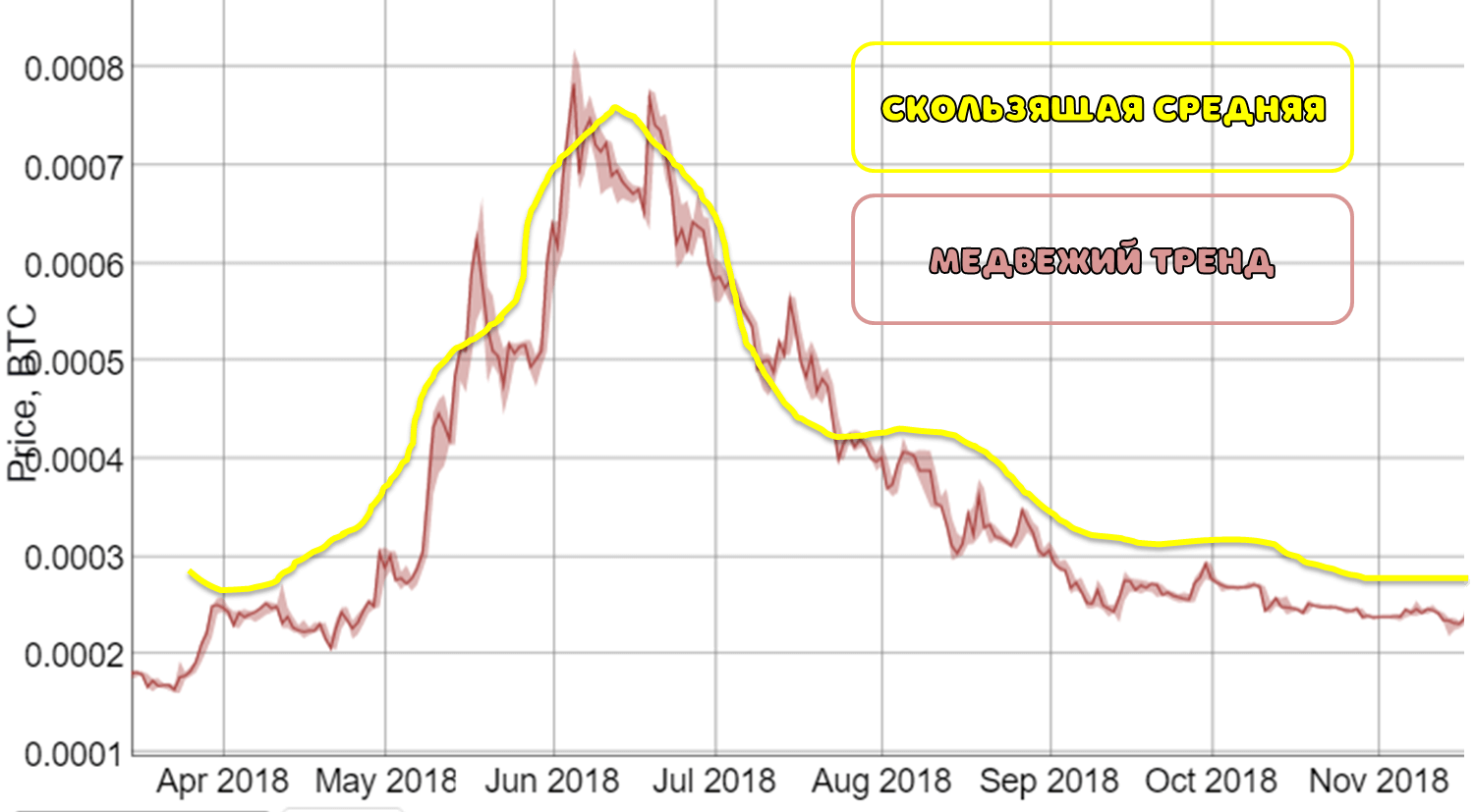 Что это значит? На графике медвежьего тренда обязательно будут пики минимума, когда стоимость криптовалюты достигала своего рекордного минимального значения. Так вот каждый из этих пиков также должен «соблюдать» нисходящую тенденцию: каждый последующий пик должен быть меньше предыдущего.