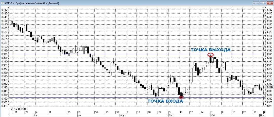 В качестве иллюстрации сказанного рассмотрим участок графика акций ПАО «ОГК-2».