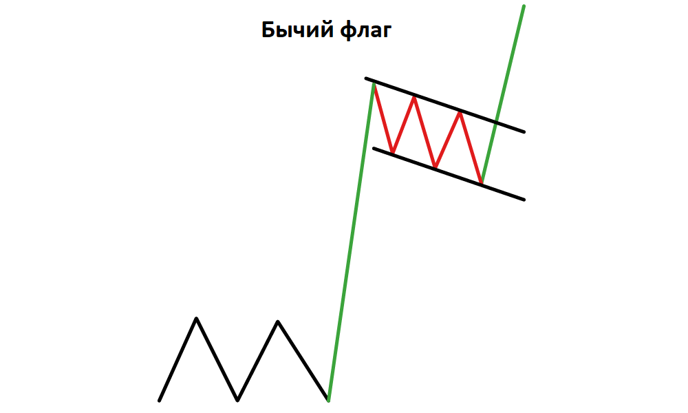 Первая фигура, которую мы рассмотрим, получила название «Флаг» из-за своего внешнего сходства с ним. Флаг появляется только при сильном тренде, в отличие от остальных фигур.