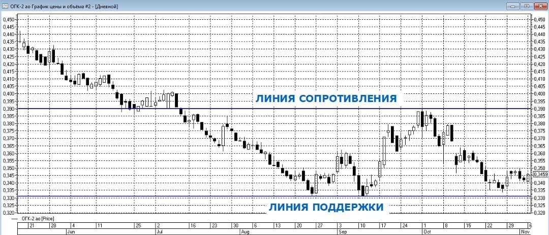 В приведенном примере линия поддержки соответствует значению 0,3311 рубля, а сопротивления 0,3899 рубля. Помните, цены актива внутри боковой тенденции движутся как угодно. До момента выхода котировок за пределы горизонтального диапазона бессмысленно усматривать в подобных колебаниях какие-то закономерности.