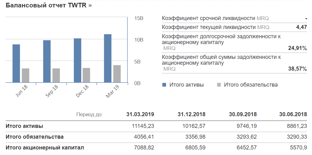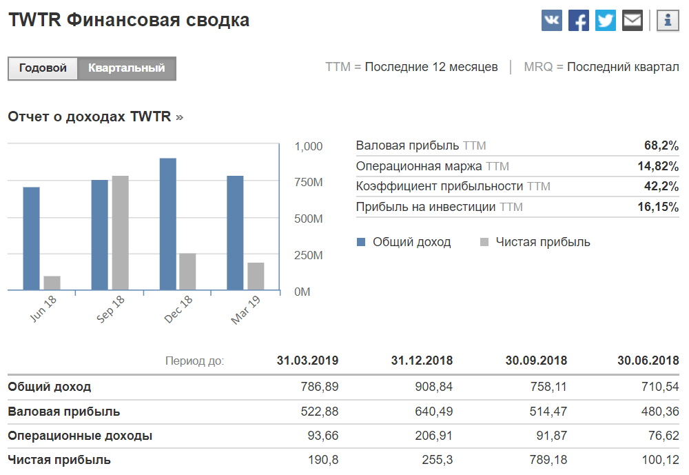 Доход компании за последний квартал 2018 года составила $909 млн, то есть на 177 млн больше, чем в аналогичный период в 2017. $791 млн получен от рекламы. На конец квартала чистая прибыль увеличилась $255 млн ($91 за тот же период 2017-го). Годовой доход компании равен 3,04 млрд долларов, что на 600 млн больше дохода за аналогичный период прошлого года. Чистая прибыль составила $1,2 млрд (2017 Twitter завершил с $108 млн убытка).