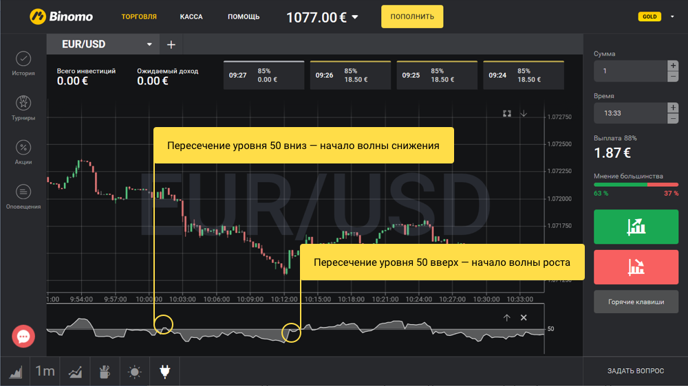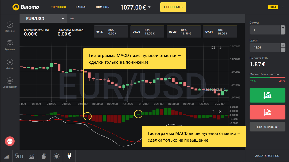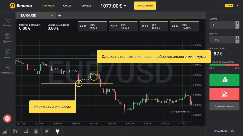 Все необходимые инструменты для торговли данной стратегией имеются на торговой платформе брокера бинарных опционов Binomo