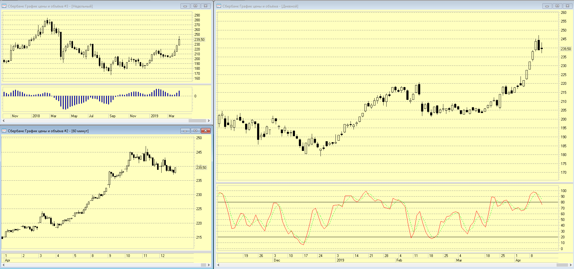 - Если торговля идет внутри дня и позиции удерживаются меньше часа, то центральным экраном будет 10-минутный график, старшим — часовый графики, а младшим — двухминутные.