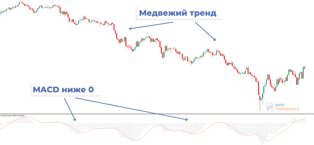 - Если столбцы гистограммы индикатора расположены ниже нулевого уровня шкалы — на рынке снижающийся тренд, сделки можно заключать только на понижение