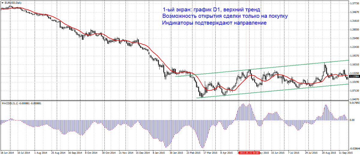 - нисходящий тренд, то на среднем экране нужно искать восходящий;