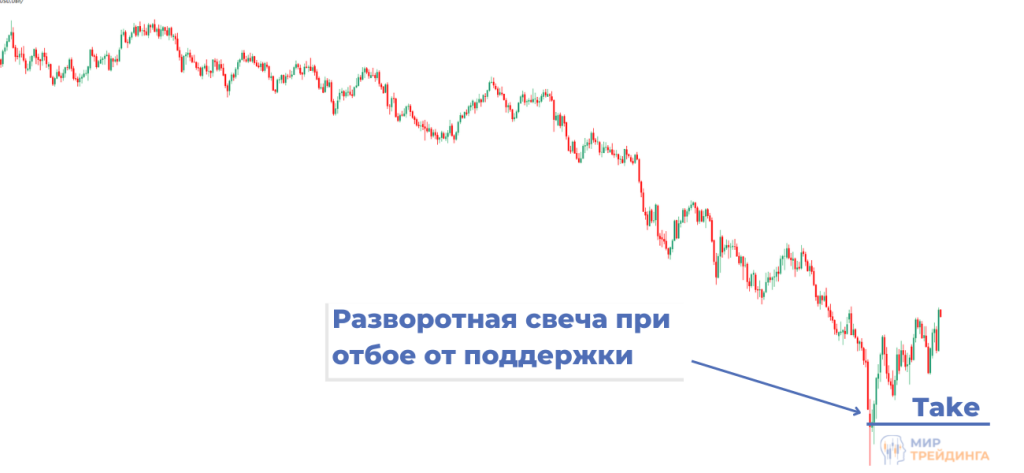 Сигналы предлагается искать на чистом графике, а именно – на свечах. Когда мы знаем, что цена зашла в разворотную область и в ближайшее время начнется продолжение главное тренда после коррекции, вероятность успешного входа повышается. Последовательность действий можно описать следующим образом: