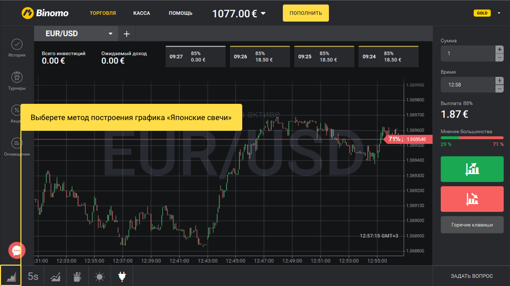 Итак, для торговли по стратегии выберите любой из торговых активов платформы Binomo и укажите метод построения графика «Японские свечи»: