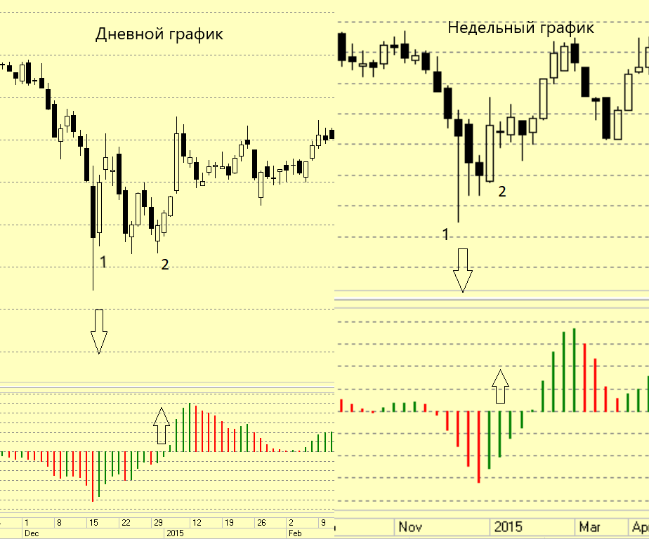 Рассмотрим на конкретном примере (рисунок ниже). На дневном графике (для нас это средний экран) образовался новый минимум. Мы раздумываем, не войти ли в позицию (ситуация под цифрой 1). Переходит на старший недельный таймфрейм и видим, что снижение MACD еще не закончилось, сигнала нет. Дожидаемся, пока тренд начнет разворачиваться на неделе (2), и только после этого входим в позицию.
