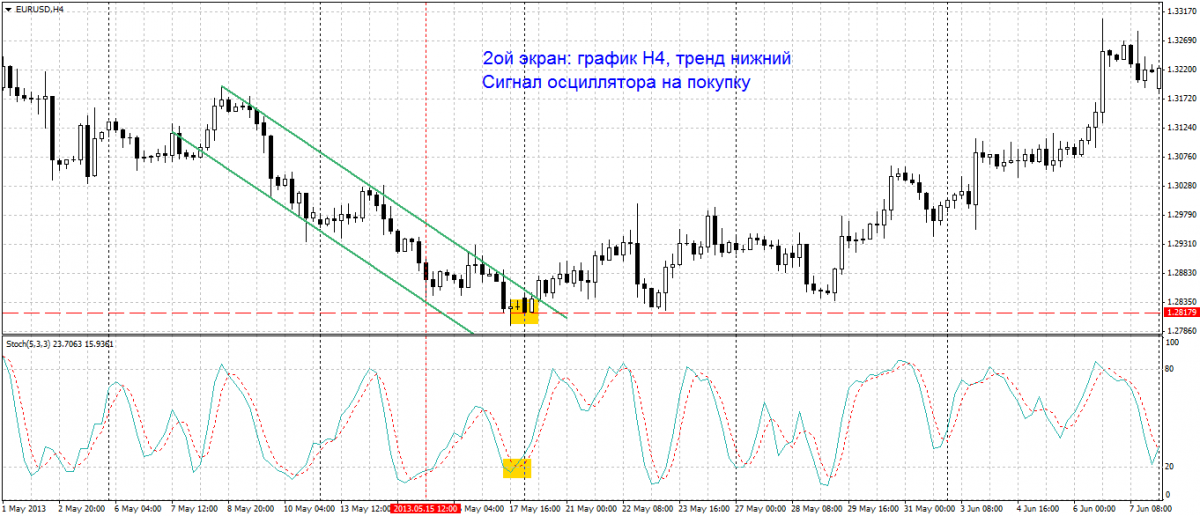 Если тренд на первом экране идет вверх, то на втором экране во внимание принимаются только сигналы на покупку. Если вы уже находитесь в позиции, то в эти моменты можно увеличивать позицию