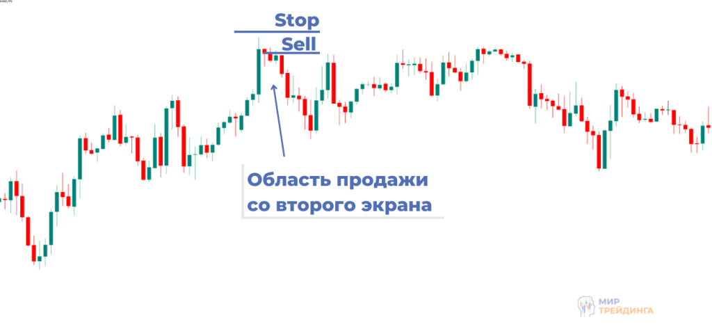 Условия для открытия ордера Sell по стратегии трех экранов, аналогично только что рассмотренному условия для открытия ордера Buy, только в зеркальном отображении.