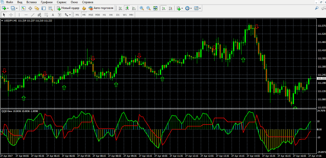 На графиках рисуется лишь стрелка вниз/вверх – это и есть сигнал для открытия торговых позиций