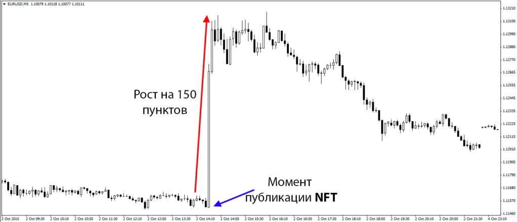 Поскольку публикация NFP является одним из наиболее важных событий, а его значение почти всегда отличается от прогнозов экономистов (не то что в случае с процентными ставками), практически каждый раз следует ожидать очень динамичной реакции рынка сразу после его публикации. Поэтому в качестве примера была взята последняя доступная публикация.