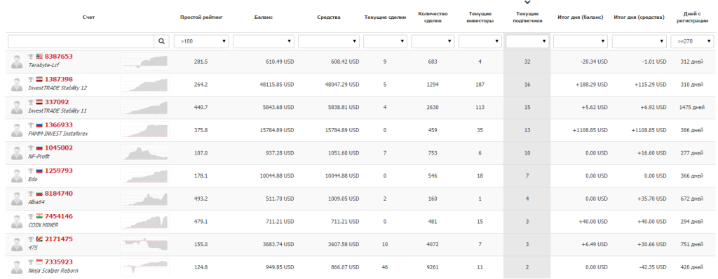 Если добраться до конечного пункта, то все уже становится более просто, понятно и удобно. Можно выводить информацию в полноэкранный формат. Там же можно добавлять колонки доходности за необходимые временные интервалы в один клик, изучать колонку «текущие инвесторы», где представлен рейтинг счетов по популярности. Выбирать управляющего здесь в «ИнстаФорекс» нужно в соответствии с общепринятыми правилами и нормами.