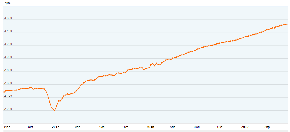 27 марта 2018 года 1656,56 рубля. За полгода цена уменьшилась на 1,67%. 27 июня 2018 года ОПИФ стоила 1652,63 рубля. За 3 месяца стоимость актива снизилась, хотя в конце рассматриваемого периода наметилась положительная динамика.
