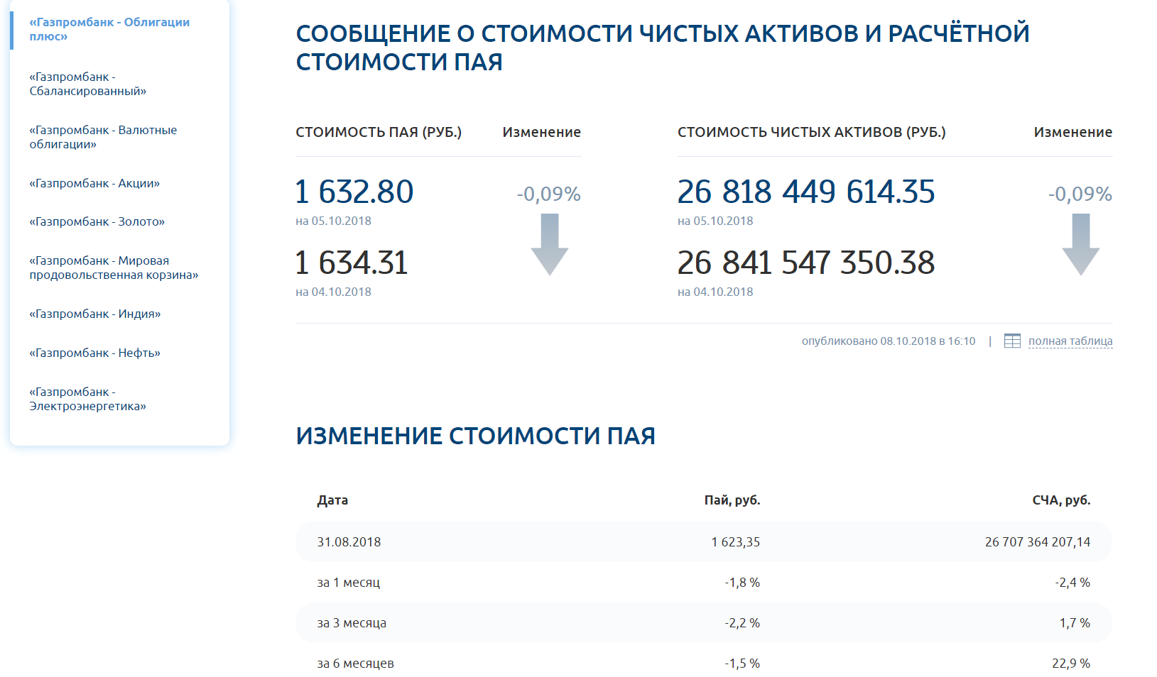 - Стоимость пая «Газпромбанк – Облигации Плюс» за последние 3, 6, 12 месяцев.